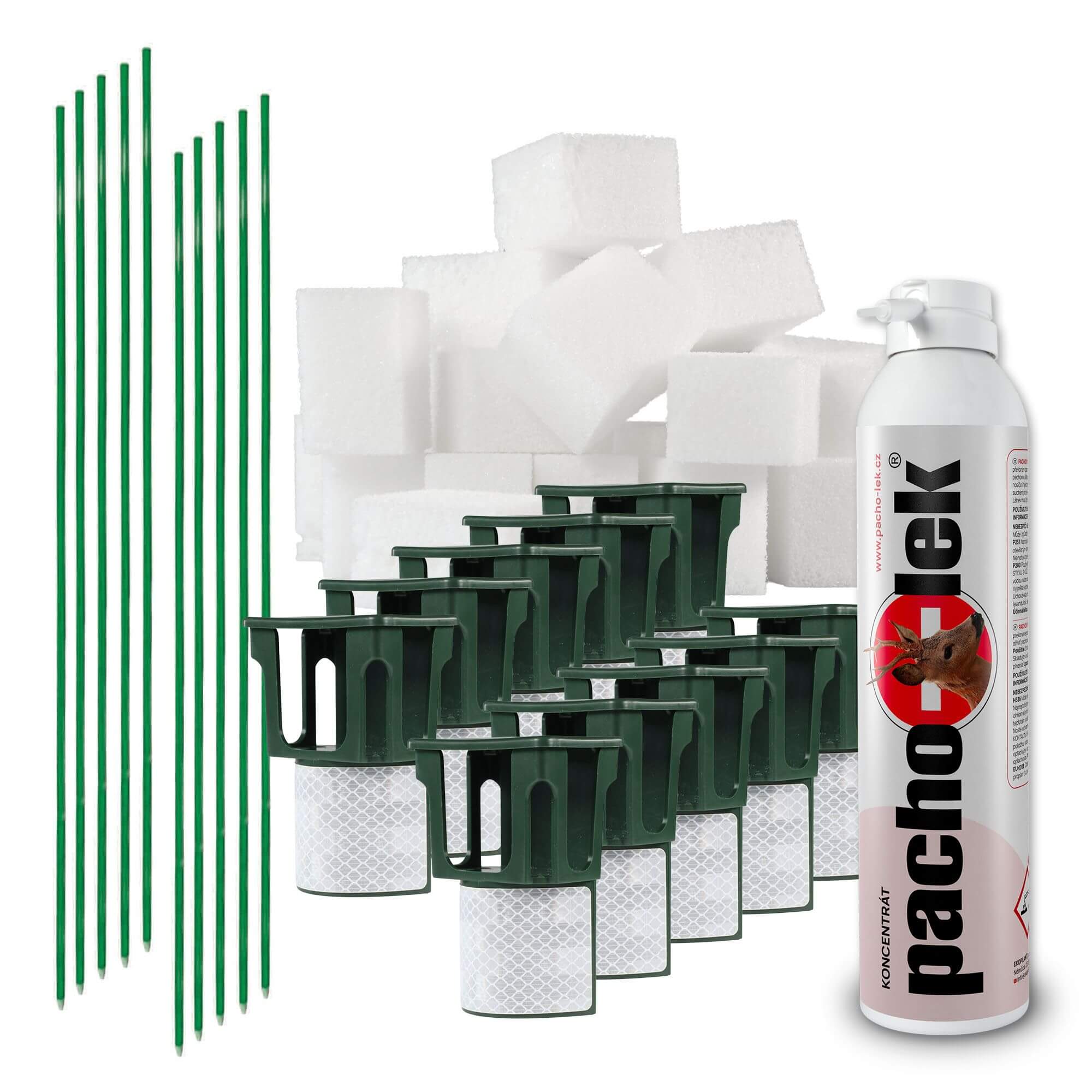 Sada pro kompletní instalaci pachového ohradníku obsahuje 250 ml koncentrátu pachového ohradníku, který je účinný proti srnkám, jelenům, muflonům, daňkům, divokým prasatům a zajícům. Stabilní a dlouhodobou konstrukci pachové bariéry sestavíte pomocí sklolaminátových sloupků, které jsou v sadě po 80 kusech včetně PROFI adaptérů s reflexní páskou a nosiči pachové látky BIO PU pěny BIO10-PO.