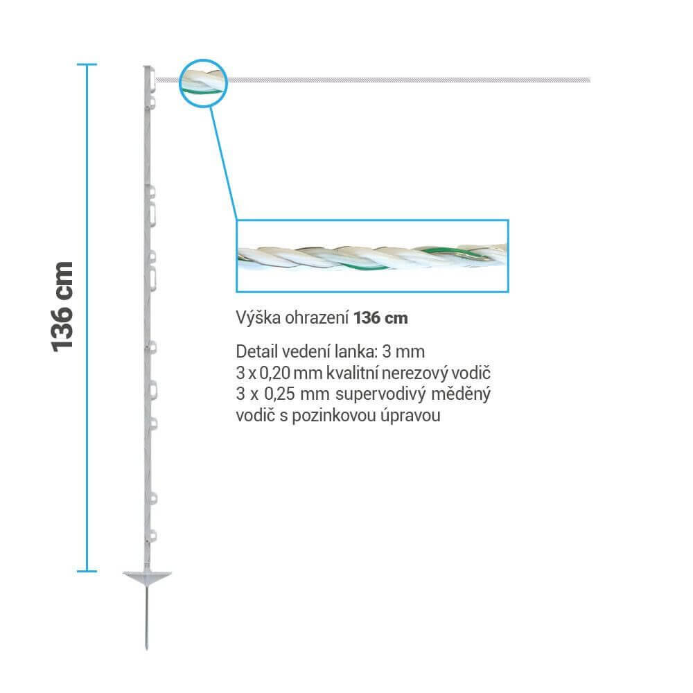 High-quality white tape 200 m wide with 2 mm copper conductors ensures maximum conductivity - resistance 0.45 Ω/m. Fencing heights of up to 136 cm can be created with fixed plastic posts with 11 eyelets for individual wire pulling. The mobile plastic posts can be easily moved. There is also a 100 cm ground rod for earthing the fence.