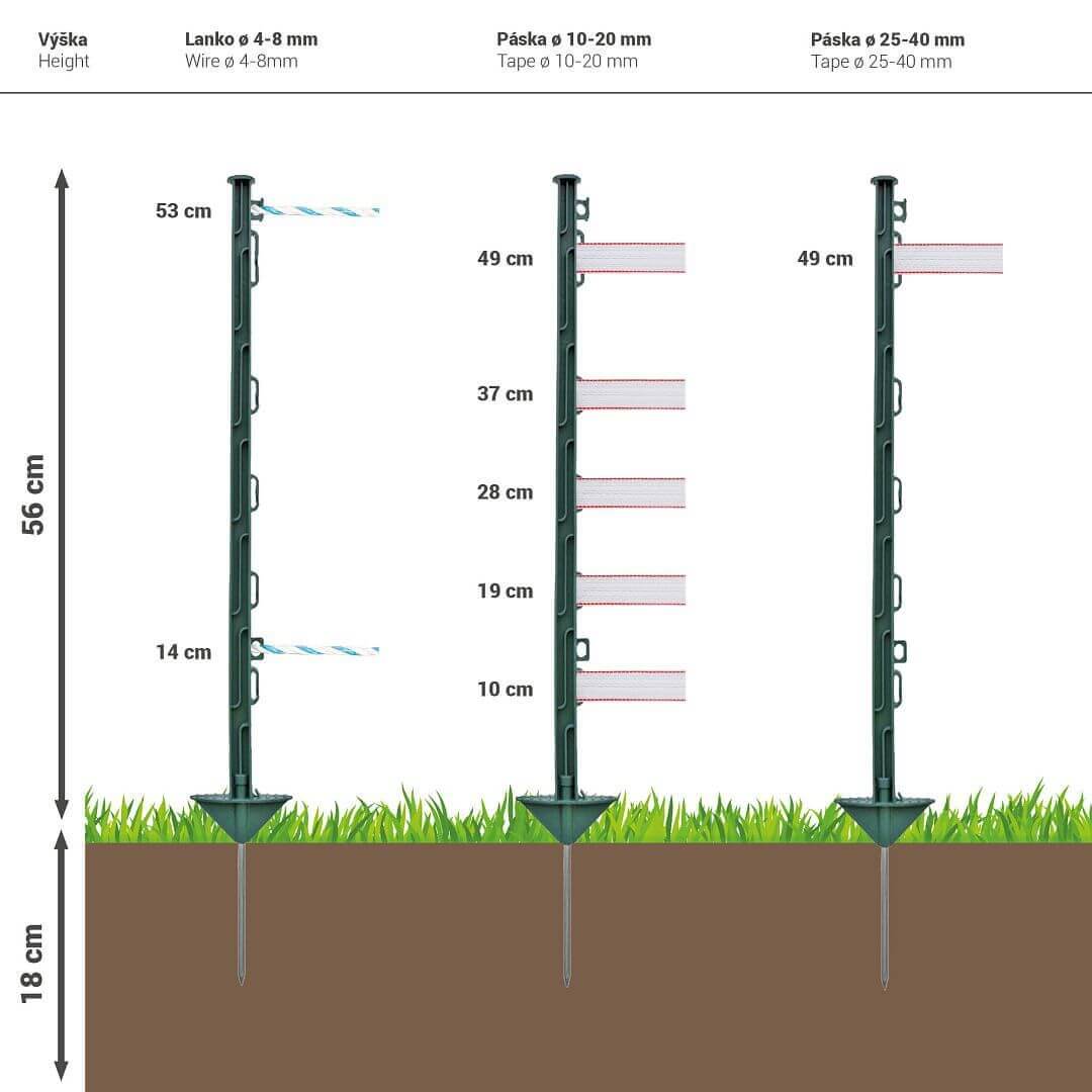 - 10× post 74 cm (above ground 56 cm), 7× eyelet